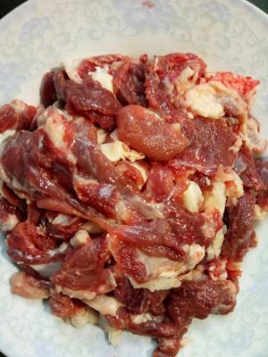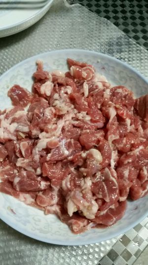 新鲜羊腿肉去筋膜脂肪切厚片、不剃干净筋膜的话到时候肉的口感会发硬咬不动。这个肉片的厚薄按个人喜好。