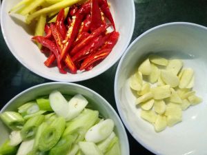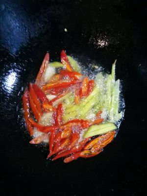 热锅放适量油,倒入鲜辣椒,葱姜蒜爆出香味。