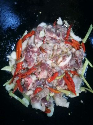 起锅倒油,先放羊肉煸炒,把肉里水份煸没,炒出油