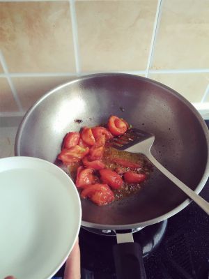平底锅中倒入西红柿块,用铲子翻炒3分钟出汁,再将炒好的鸡蛋倒入。