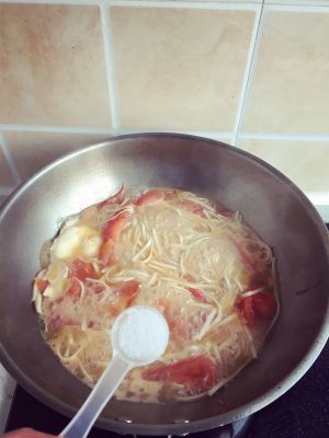 炒蛋,蛋呈嫩嫩的金黄色后将切成丁的西红柿放进去一块翻炒。依次加酱油,盐,要多放些,因为这是为汤做准备。