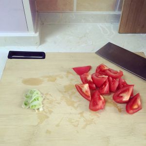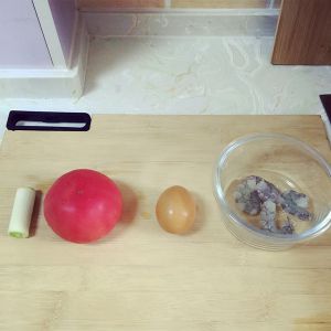 打蛋,搅拌。切西红柿,一半切成小圆片,一半西红柿切丁。然后热油,别太热,这样的油煎出来的蛋嫩。