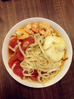 面条熟了以后夹出来,放入准备好的西红柿炒蛋汤内,并将食材摆盘,最后将生的圆片西红柿放入,并在上面撒上糖。收拾好厨房就可以享受啦!