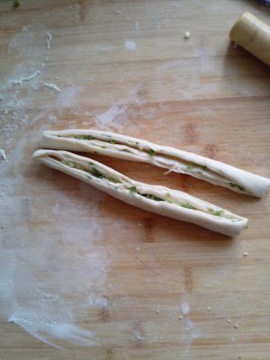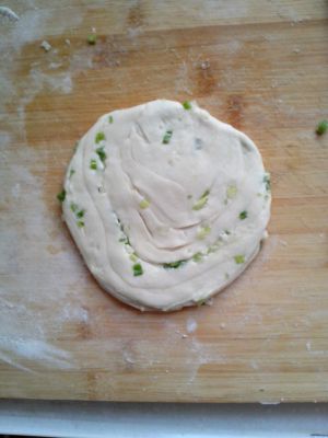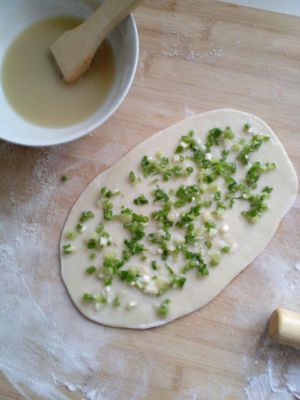 小面团擀成薄厚均匀的长方形,刷上油酥,撒上葱花