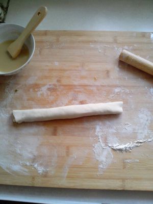 把刷好葱油的面饼卷起来,然后立起来用手压扁,如果面饼比较大也可以卷起来之后中间一切然后压成两个饼。压编之后就用擀面杖擀薄。