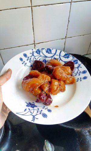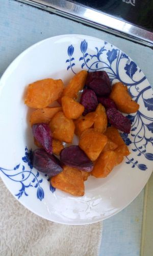 盘底提前抹点熟油,盛上地瓜,沾水吃。。