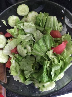 所有食材倒入大盘,面包块最后放,软了就不好吃了。没拌匀,放橄榄油,盐,我还加了油醋