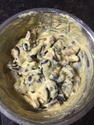 把腌好的香菇放入面糊里,使每个都粘上面糊。