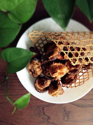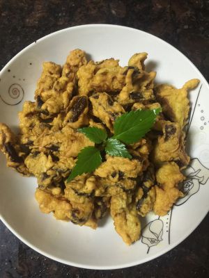 美味的炸香菇就做好了,为了美观用了家里特有的香叶做点缀