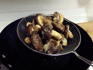 油烧热后先放一块试试,能炸了就把沾了面粉糊的香菇一块一块的放进去炸,不要偷懒一下全放进去哦,这样会全部粘在一起。