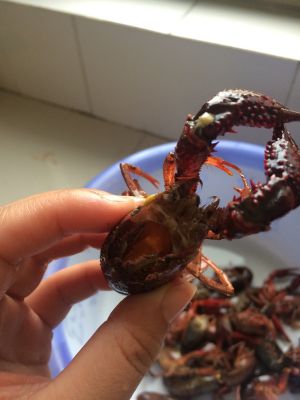 小龙虾洗干净,剪去沙袋,我爸非要把头那全去了,那就由他吧。可怜我的虾黄,起锅根本不见了。