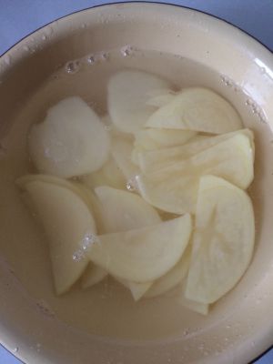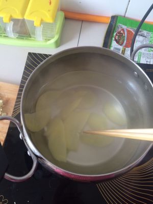 土豆片用水焯一下 七八成熟吧!太面了也不太好吃,有点脆脆的。捞出土豆片铺在一会装虾的容器里。