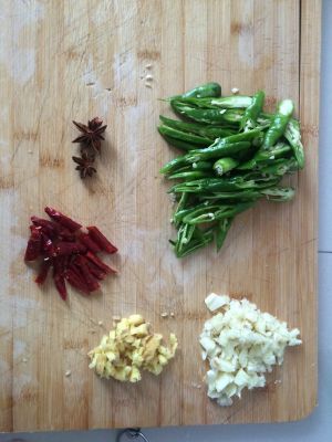 将就剩下的油,多了可以舀点出来,葱姜蒜线椒八角爆香,干辣椒等会啊