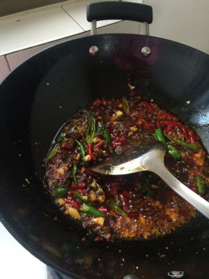 加入葱姜蒜,香料,花椒,干辣椒炒香