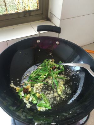 多倒点油,油热了快速焯虾 时间别久 虾变红即可出锅 ,大概十几秒左右,注意不要一股脑全倒进去,那样焯不太好,图上我就是倒太多,吸取我的教训 ,少量的炒,很快的。