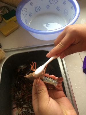 买回来的小龙虾可以先用清水加一些醋泡二十分钟左右,再仔细拿刷子刷一刷肚子上面黑黑的东西,很脏,最后可以处理虾头和虾线了