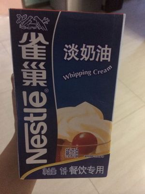 把淡奶油和糖混合、小火加热搅匀(不能热开),直至糖溶解、放凉。