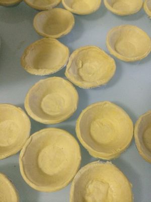 蛋挞皮提前10-15分钟从冰箱取出解冻、待稍软后去掉锡膜