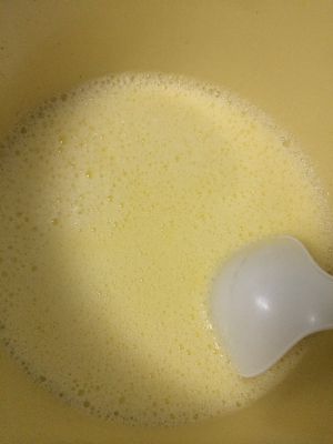 将鸡蛋打散后加入到温热的牛奶中搅匀,最后加入少量低粉拌匀。