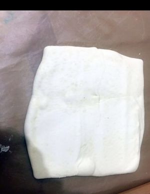 成长方形后,把上面对折到中间,把下面也折到中间,然后用保鲜膜裹起来,放冰箱冷藏二十种。