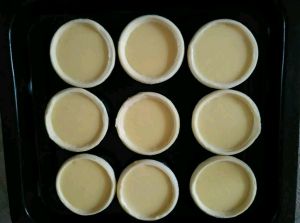 将冰冻好的面团,分成小团,放入蛋挞模,压成蛋挞皮