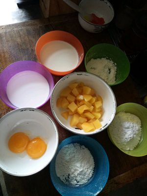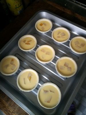 取出冷冻的蛋挞皮,蛋挞皮不需要解冻,加入自制蛋挞水,加入黄桃块!