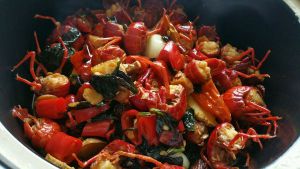 把之前炸的小龙虾用盘装起来,锅里到入小量油,把蒜蓉,尖椒,洋葱爆炒一下再把龙虾倒入一起翻炒,加入料酒,盐一点点,糖,我放了三大勺(喜欢吃甜点可以多放点)不管任何调料建议先少放,不够还可以再加