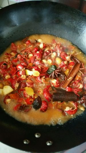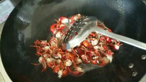 留底油下入豆瓣酱和步骤二准备的配料,炒香后下龙虾翻炒,这里豆瓣酱的量根据自己的口味来放