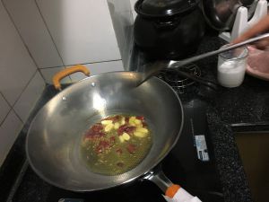 油热后加入蒜末炒香;