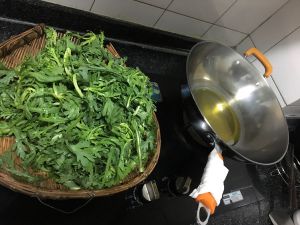 倒入洗干净的茼蒿菜,大火翻炒;