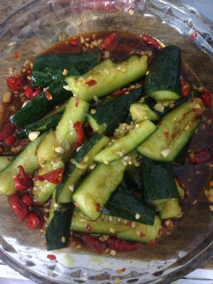 最后,把黄瓜和勾兑好的汤汁、蒜泥、干辣椒拌匀。