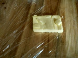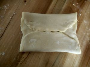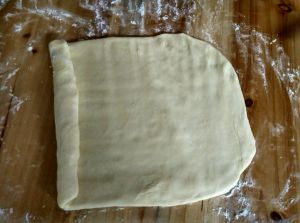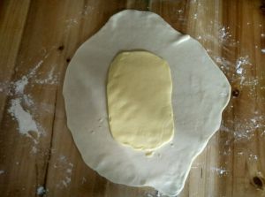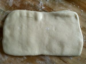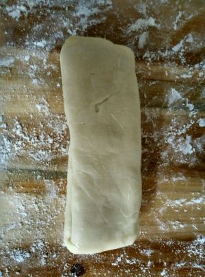 反面,用擀把裹好黄油的面皮擀成长方形,(初次擀难度有点大,但据君之的说法是:多练几次就好了