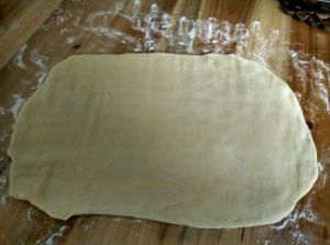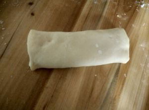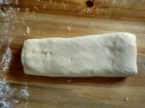 重新将按板洒上干面粉,将冷藏好的面团放按板上,擀成0.3cm厚的面皮。