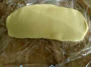 18.挞皮终于完成了!放烤盘上,盖上保鲜膜最后冷藏半小时。(盖保鲜膜是为了还让冰箱里其他东西的气味跑到挞皮里)