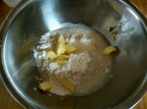 将20克黄油切小块放至室温软化,面粉里倒入黄油、糖、盐、水搅拌均匀。