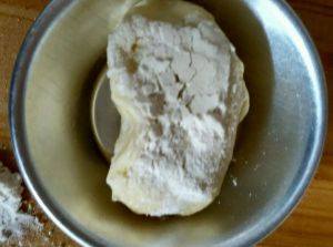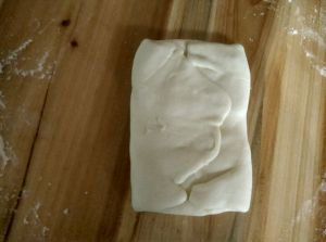 重复第8.9的步骤,然后放冰箱冷藏15分钟。(注意:每次从冰箱拿出面团都要重新在按板上洒上干粉,再继续,不然面皮会沾在按板上拿不起来)