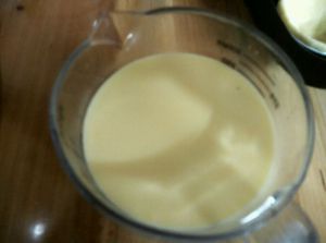 终于到蛋挞水了,把牛奶和糖放入锅里开小火边煮边搅拌,直至糖完全溶化,关火。取出牛奶,倒入淡奶油、炼乳、蛋黄,搅拌均匀,然后用过筛,蛋挞水就完成了。(煮牛奶时煮至糖溶化了要马上关火,不能煮太久。我用量杯装好,方便倒挞水)