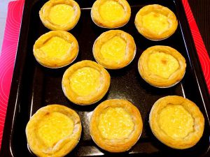 220度预热5分钟,把蛋挞液倒入塔皮里面。中层烤20 分钟,成品就出来了。如果想颜色好看点,可以上层考2分钟就可以了。