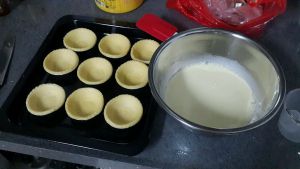 将蛋挞液过筛倒入量杯中,再倒入蛋挞皮,9分满ok。