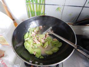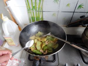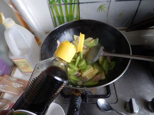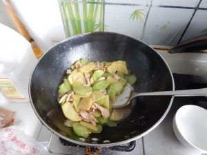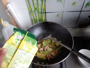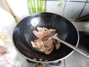 5、将肉的水分炒干后倒入料酒、蚝油、生抽、老抽、醋少许翻炒均匀。 然后倒入半锅开水,小火煮。