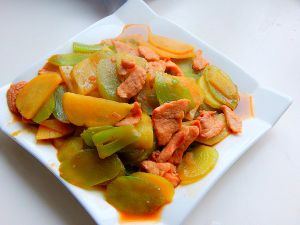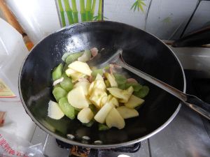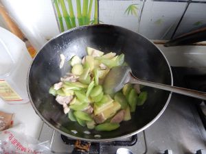 把肉切块,要是开水直接飞一下肉太紧了,可以像做回锅肉一样的提前煮一下,排骨也是提前煮一下,也节省时间