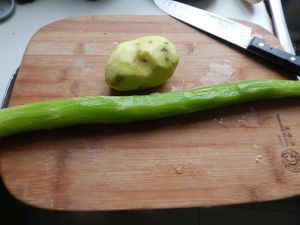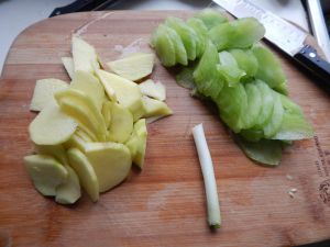 土豆切块,放有水的碗里备用。土豆要是不放水里会变色。等用之前沥干水份!