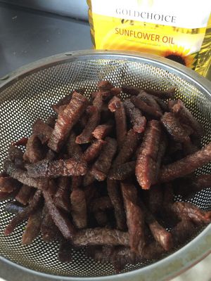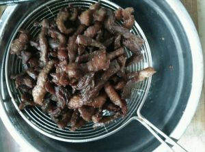 油温再次上升,复炸一遍,直到牛肉有些硬又不太干的时候捞出。