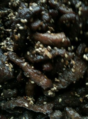 锅里留少些油放辣椒面炒香,牛肉倒入锅中,放孜然和炒过的芝麻,翻炒均匀后出锅。(图片拍的比较暗,因为下雨天:))
