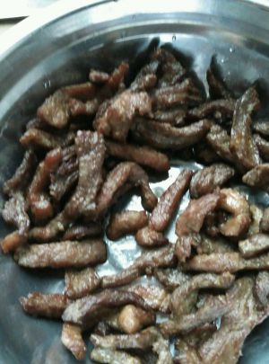 香香辣辣,货真价实的牛肉干就做好了,儿子很喜欢吃,自己做的,没有添加剂,尽快吃完,一盘牛肉,成品不多,一天三餐,儿子都要倒点出来吃,味道是很好,就是成本有点高,不过孩子喜欢吃就无所谓了。
