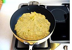 烧热平底不粘锅,涂些油,倒入适量面糊。