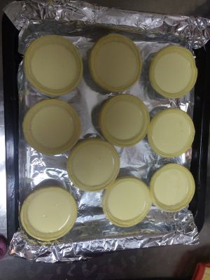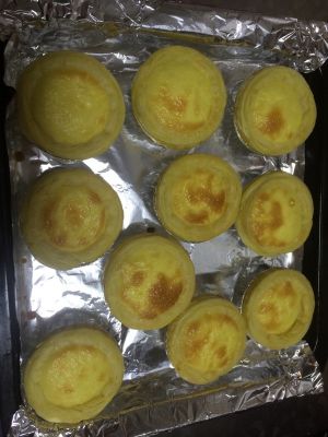 烤箱上下火220度预热5分钟,同时把挞水倒入蛋挞皮中。七分满即可。我的蛋挞皮就是一般的size,做了15个。这个量不一定的。反正能装几个就几个。