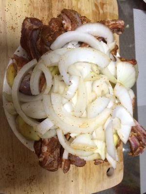 浸泡控水后的羊排,将搅拌后的孜然粉均匀抹在羊排表面,多放才好吃,然后一层洋葱姜片一层羊排放好?