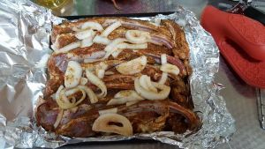 羊排让卖家剁成细段子,我还买了几个羊尾巴一起烤了。洗净控干水,加了两勺五香粉,一勺老抽,一勺生抽,两勺白酒,一勺孜然粉,半勺白糖,一勺盐,一点味精,最后把洋葱切小块放里拌匀