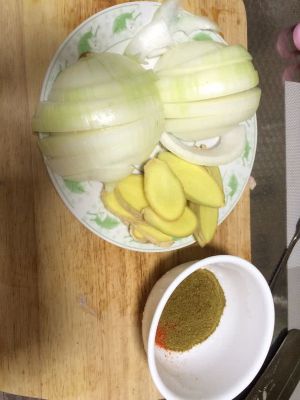 羊排凉水浸泡半小时以上,准备大量的姜片和洋葱。让后准备孜然粉、辣椒粉和盐混合备用?